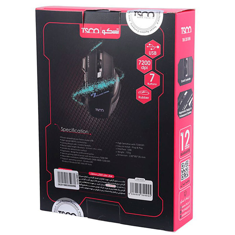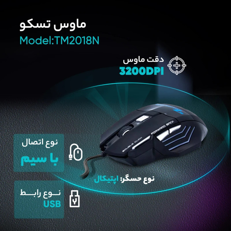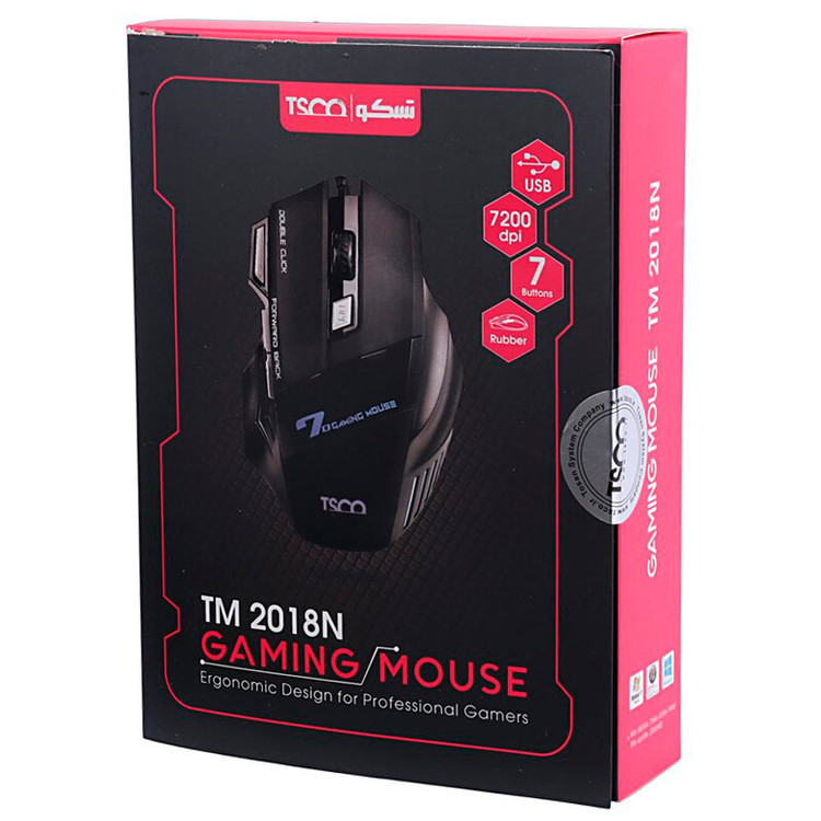 ماوس تسکو مدل tm2018n یکی از موس های گیمینگ باکیفیت موجود در بازار است که از متریال مقاوم ساخته شده است. سنسور های این موس دقت ۳۲۰۰ DPI را دارد که برای بازی کردن مناسب است. همچنین موس Tsco TM-2018N دارای ۷ دکمه است: ۲ دکمه کلیک معمولی، یک دکمه چرخان وسط، دکمه تنظیم dpi و ۳ دکمه اضافی که برای استفاده راحت تر تعبیه شده اند. این دکمه های اضافی برای راحت تر کردن بازی های کامپیوتری بسیار مفید و کاربردی هستند. دکمه تنظیم dpi موس Tsco TM-2018N قابلیت تنظیم dpi در ۴ حالت بین ۸۰۰ تا ۳۲۰۰ را دارد. شما می توانید با توجه به نیاز و کاربری خود سرعت اسکن سنسور را تغییر دهید.